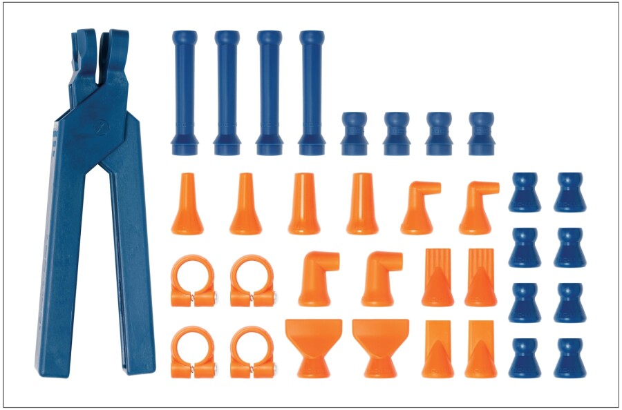 Adapters voor de Haas-draaibank in een korte (4 stuks) en een 2" lange (4 stuks) uitvoering, aangevuld met diverse slangelementen, spuitmonden, klemmen en een 1/4" montagetang.