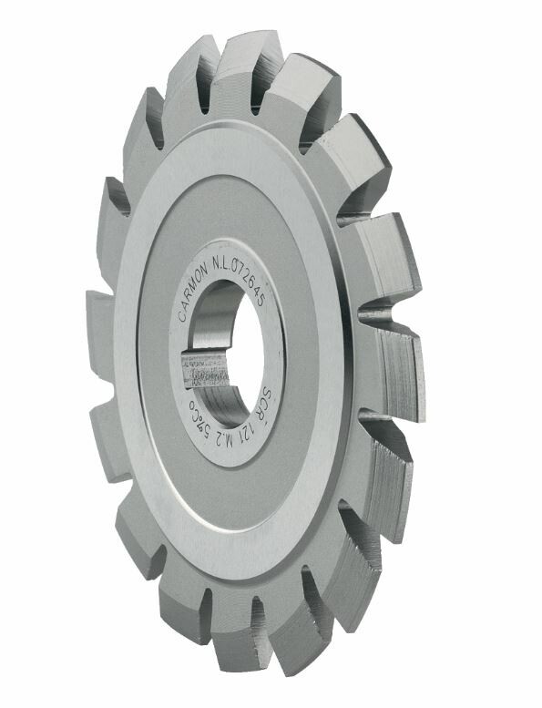 HSS-Co8 Moduulfrees van het merk Carmon. Deze frees is volgens UNI 4501-norm vervaardigd en speciaal uitgevoerd om tandwielen mee te maken. Ze worden uitgevoerd in 8 verschillende uitvoeringen afhankelijk van het aantal te produceren tanden.