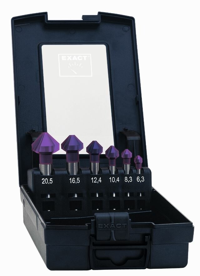 Een verzinkfrees set met HSS verzinkers. Deze hebben een 90° tophoek en zijn voorzien van een speciaal door EXACT ontwikkelde Titan Pro coating. Deze coating bestaat uit combinatie van TiN en TiAlN, wat resulteert in een betere slijtvastheid en bestand tegen hoge temperaturen (650°C). De verzinkers zijn door deze coating zeer geschikt voor materialen met een hogere hardheid. Deze set bestaat uit 6 verschillende verzinkers met de maten ø6.3/8.3/10.4/12.4/16.5 en 20.5 mm. Voordelen van de Titan Pro coating: - Verhoogde standtijd - Lagere wrijvingscoëfficiënt - Hogere snijsnelheid - Gemiddeld 25% hogere prestatie - Te gebruiken voor hardere materiaalsoorten