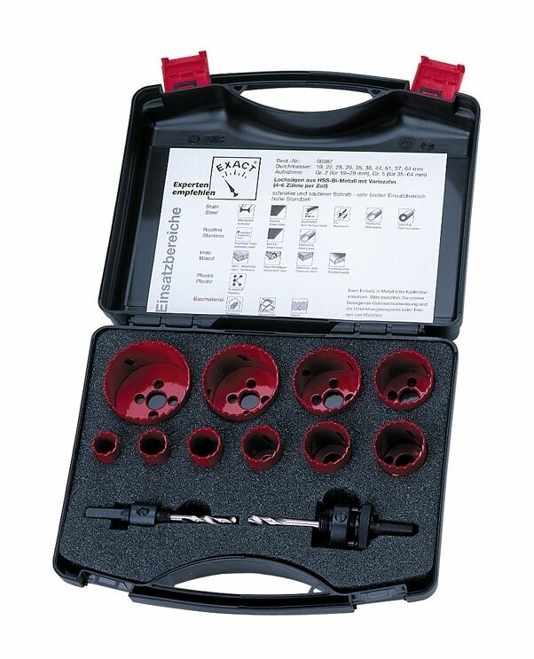 Dit zijn HSS Bi-Metaal gatzagen van het merk Exact en wordt als set geleverd in een kunststof koffer. Het zijn zagen met een variabele vertanding en een tandsteek van 4/6. Tevens beschikken ze over een positieve spaanhoek en hebben ze een zaagdiepte van 38 mm. De sets worden aangeboden in diverse afmetingen.