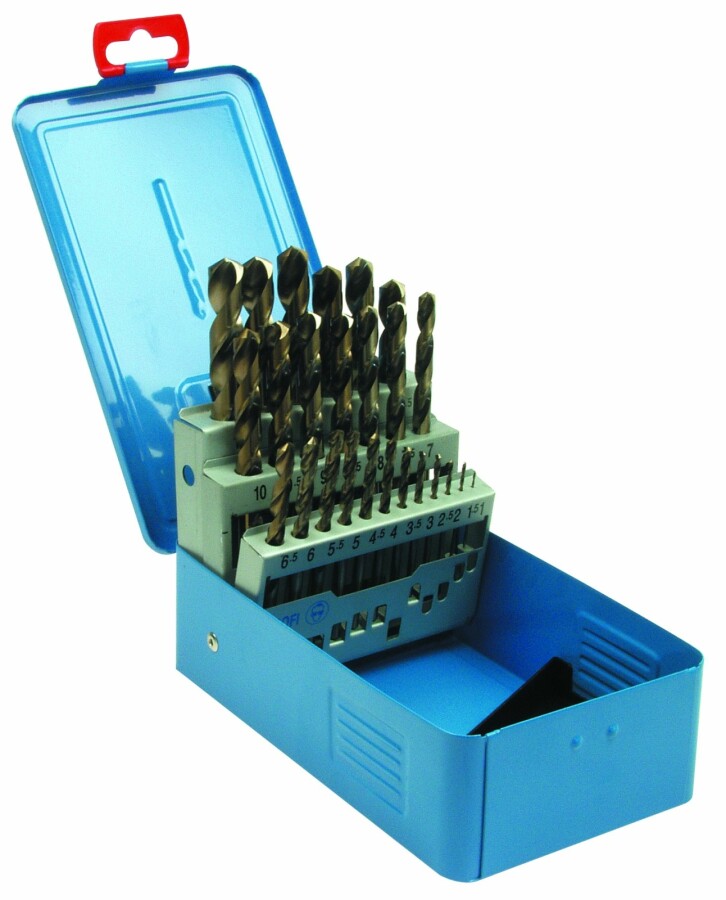 Dit is een Ratio HSS-Co spiraalboren set in een stalen cassette. Tevens hebben deze DIN 338, type N boren een cylindrische schacht en vanaf 2 mm een kruisaanslijping. Ze beschikken over een "gold-finish". De afmetingen van de boren zijn 0,5 mm oplopend, 02.9400.0024 en 02.9405.0170 hebben extra boren.